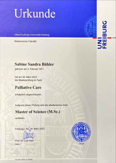 We congratulate Dr. med. Sabine S. Bühler! She has successfully completed her training as a specialist in palliative medicine with the Master of Science in Palliative Care at the Albert Ludwig University in Freiburg im Breisgau in 2023.