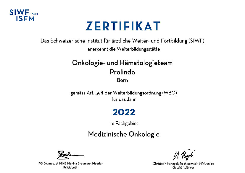 Seit dem Jahr 2020 ist Prolindo eine Weiterbildungsstätte in allen Gebieten der medizinischen Onkologie (alle Organsysteme, inklusive der Hämato-Onkologie) Kategorie B. Das Umfeld des Onkologiezentrums Bern der Lindenhofgruppe bietet eine ideale Lernumgebung in allen geforderten Gebieten der medizinischen Onkologie, namentlich in allen Organsystemen, inklusive der Hämato-Onkologie.